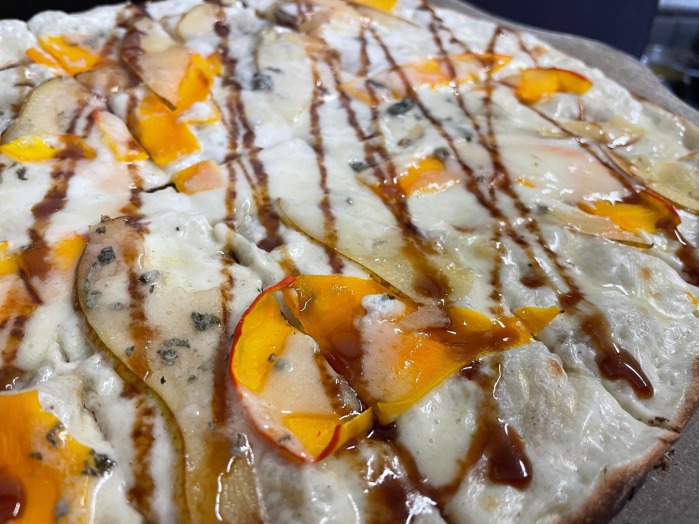 Leckerer Kürbis und Birne auf knusprigem Flammkuchenboden mit unserer hausgemachten Flammkuchencreme, dazu Roqufort und hausgemachter Biersirup.... ein absoluter Herbstgenuss!!